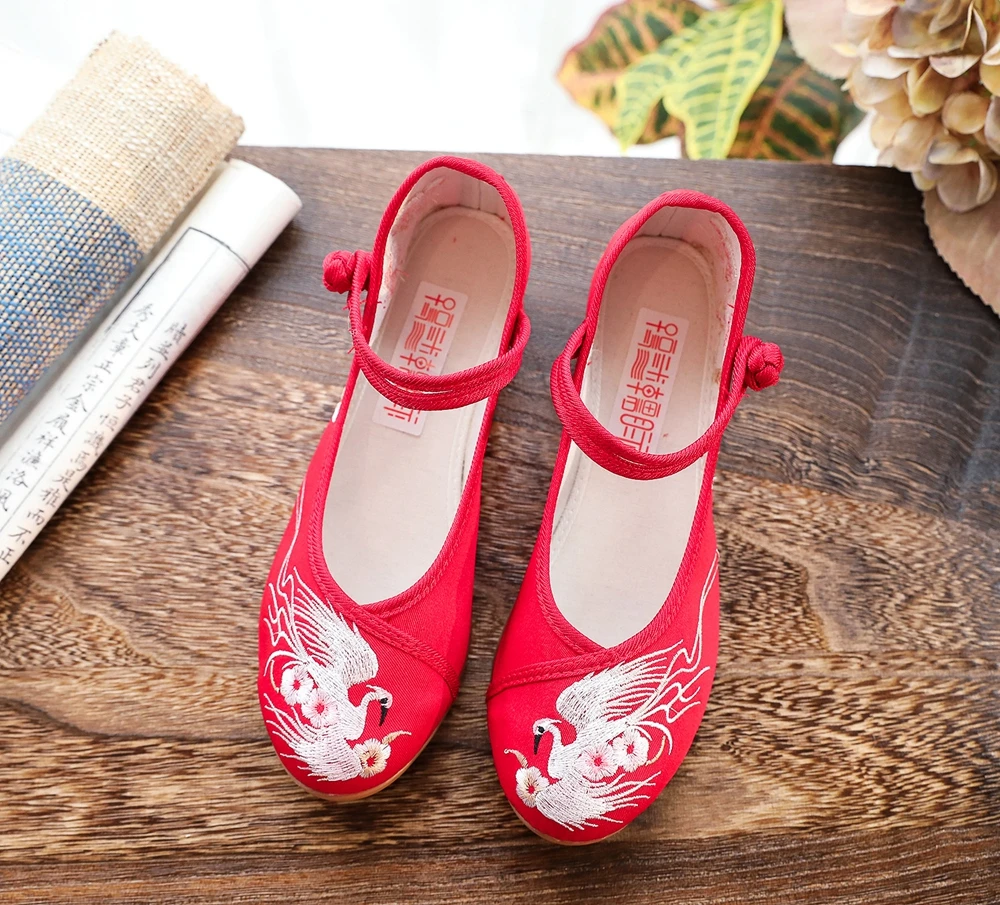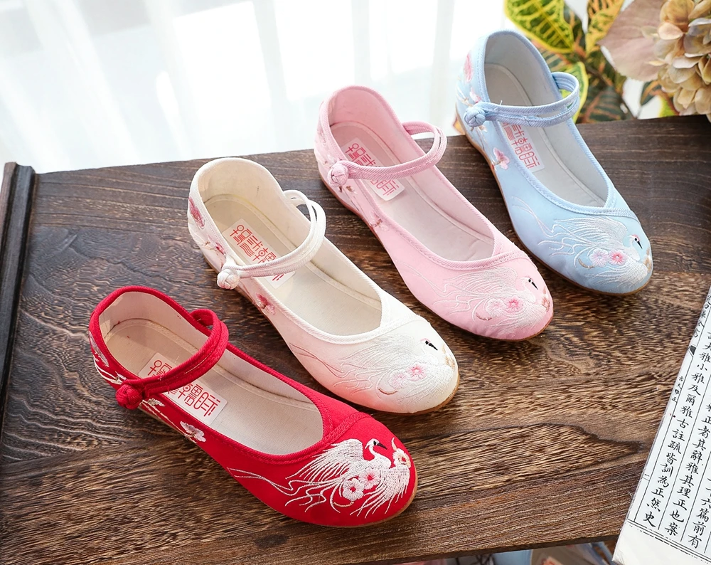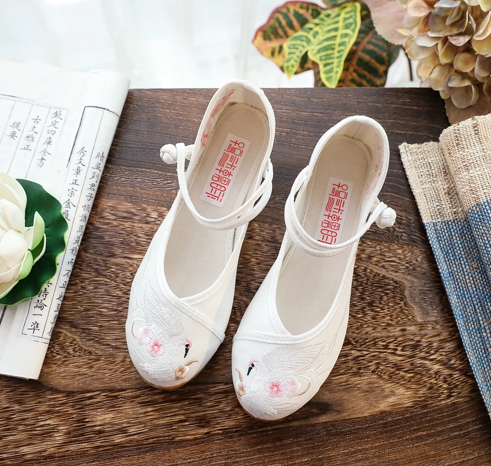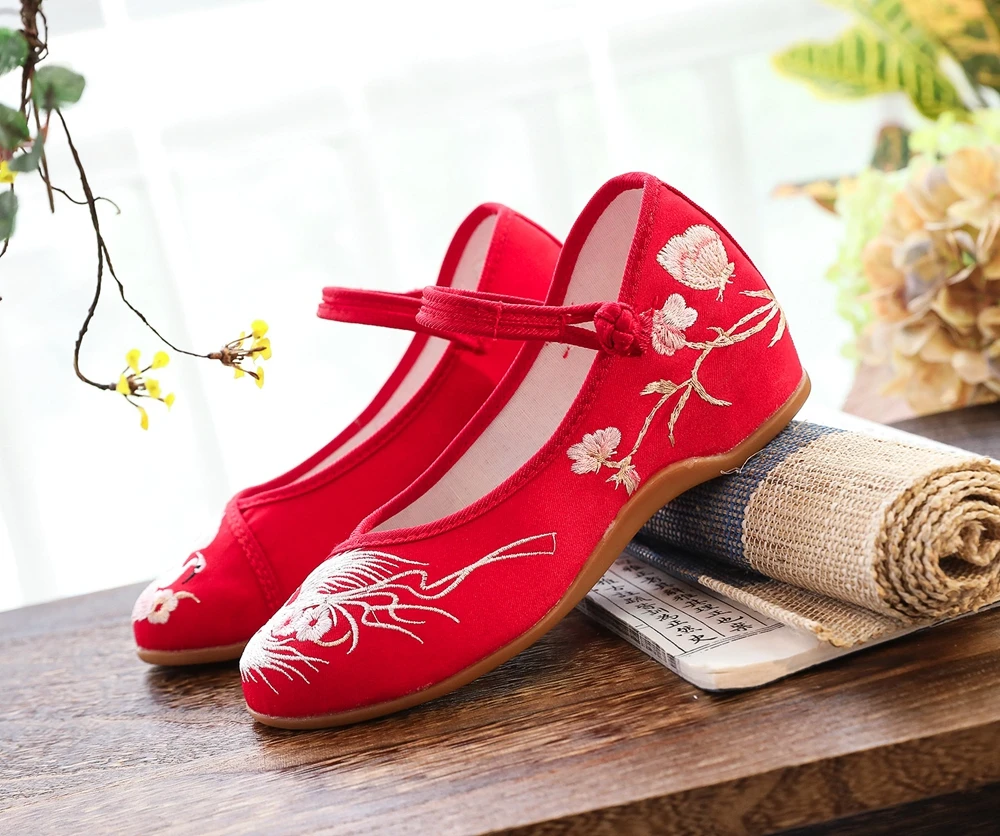 Veowalk Women Cotton Fabric Embroidered Ballet Flats Retro Ladies Casual Mary Jane Walking Shoes Comfortable White Red Blue